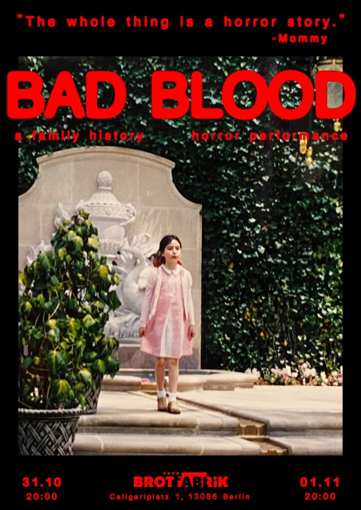 BAD BLOOD began in 2023 as a research project on my family history, horror films about motherhood and corresponding feminist theory, and the history of the abandoned infant and children’s hospital in Berlin-Weißensee. In the 3 weeks of show development, what ultimately emerged from this vast archive of research — the story that kept wanting to be told — was that of my mother. BAD BLOOD is a personal reflection of this person I call Mommy: as a figure and as a mother, in all her complexity.