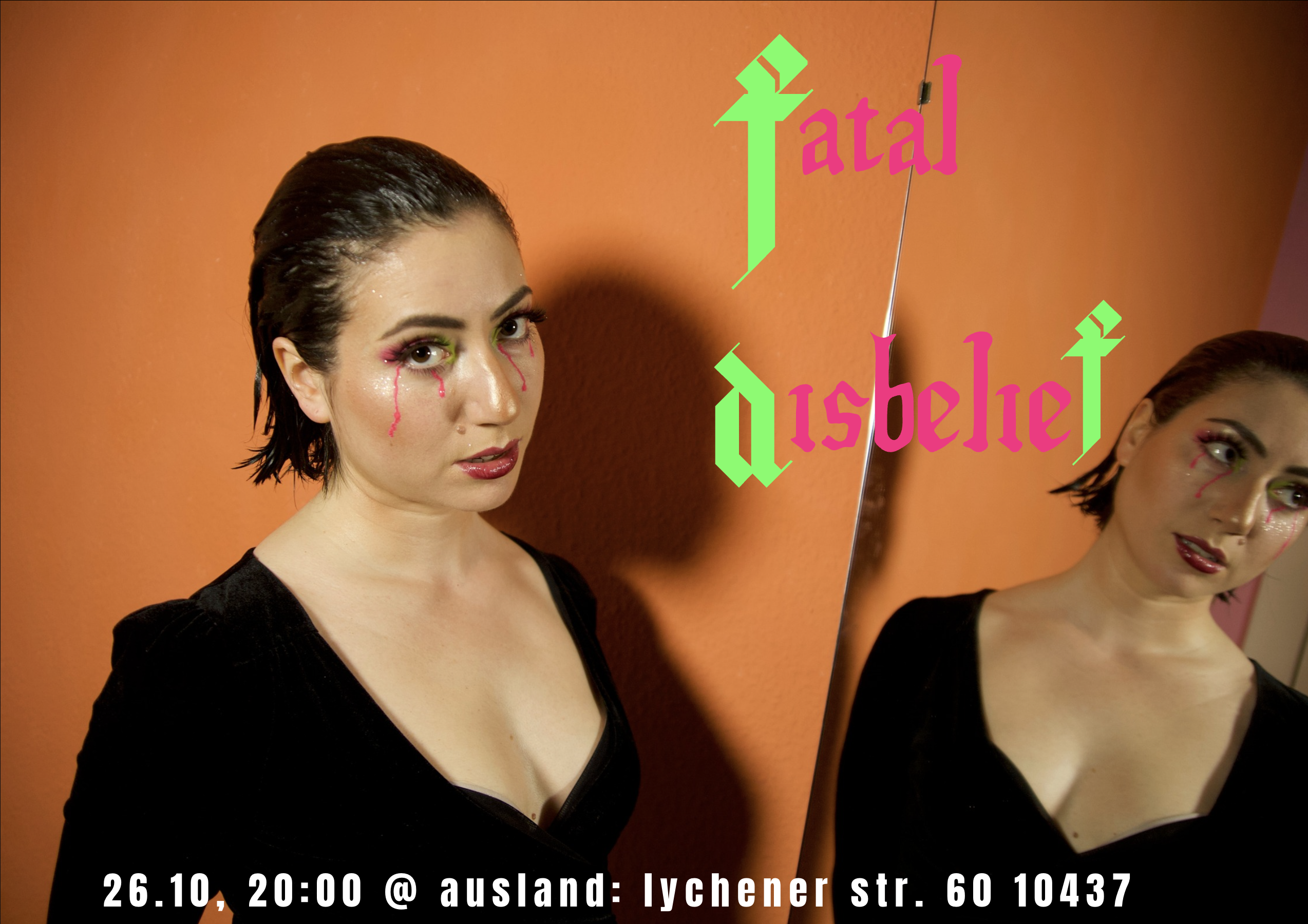 a music video performance project. Building a visceral, embodied experience of pop music, fatal disbelief embraces theatrical conventions often seen in pop music videos – hyper-performativity, direct gaze, lip sync, emotional atmosphere – to exorcise feelings of pain, sadness and loneliness and ultimately make room for healing.